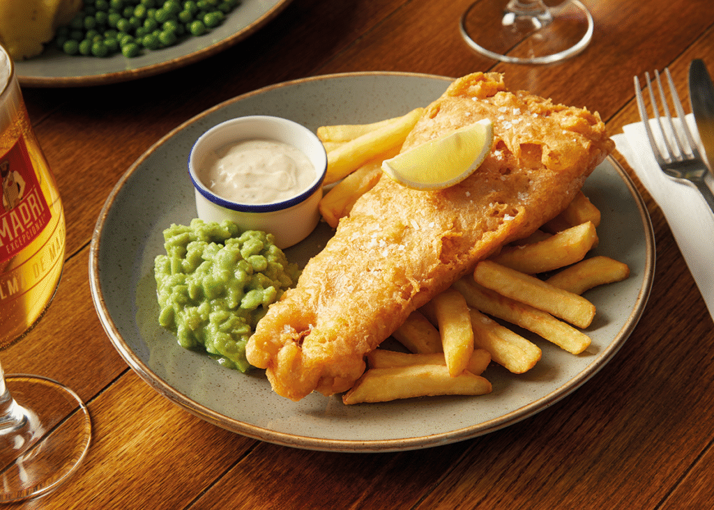 Hand-battered fish & chips, hand-battered fish fingers, served with chips and peas (†) | 4.29 712 kcals