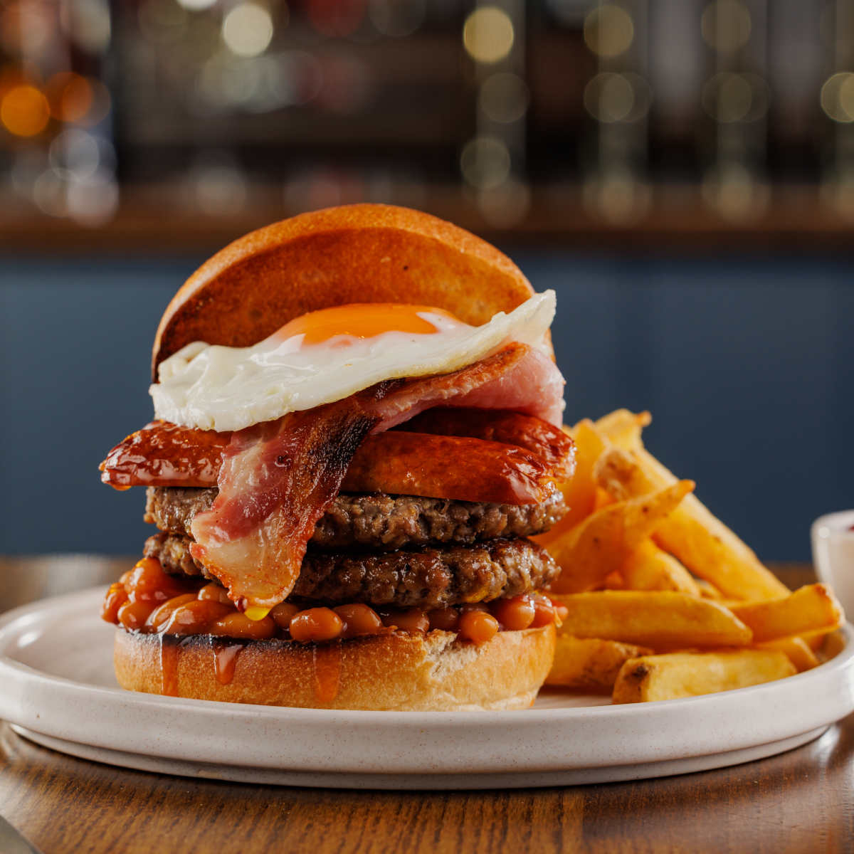 Big breakfast one, two 3oz beef patties, bacon, sausage, hash browns, free-range fried egg and baked beans | 14.29 2034 kcals