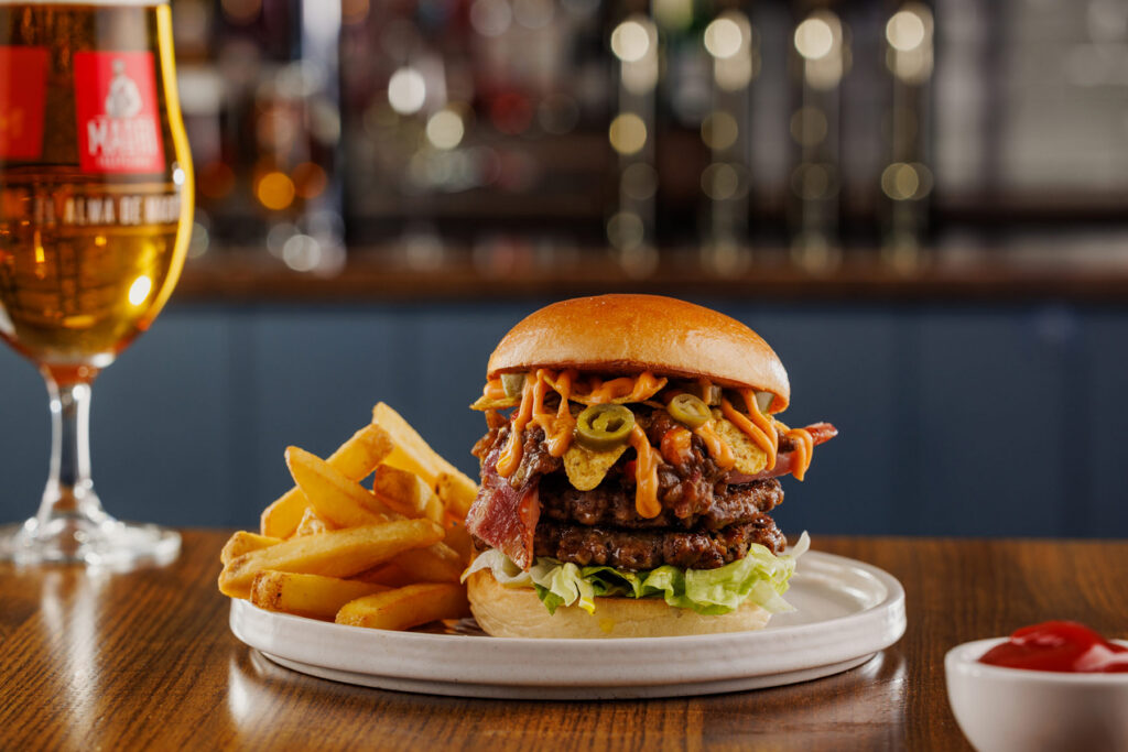 Classic burger, two 3oz beef patties with burger sauce. Served in a toasted brioche-style bun with chips | 11.99 1378 kcals